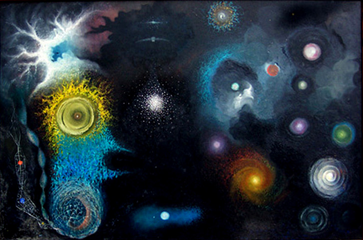 Birth in Space, created in 1962, was my earliest comprehensive cosmic painting, created when I was celebrating the birth of my first daughter. I gathered oil crayons, rendering them on a wood panel, to unleash thematic ideas that had been percolating in me during the 1950s about a bio-cosmic universe. Birth in Space captures a surreal conception of interstellar cosmic forms and appearances that unwind with life and fetus in a universe friendly to conscious existence. At the time, I was caught up with the fine-tuned fundamental constants of the universe that underlie the golden ratio and fractal recursive patterns in nature at all scales—from helical life forms to spiral galaxies. This would deepen my philosophic cosmic outlook of a new subject matter driven by anthropic ideas that set forth a carbon-based universe so finely tuned for life that conscious beings on our planet may well have been inevitable. These philosophical ideas only grew stronger during the 1960s and 70s, fed by visuals and data that began appearing from all science quarters: quantum to quasar.