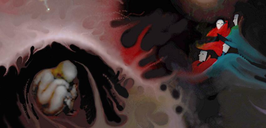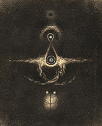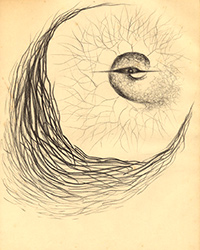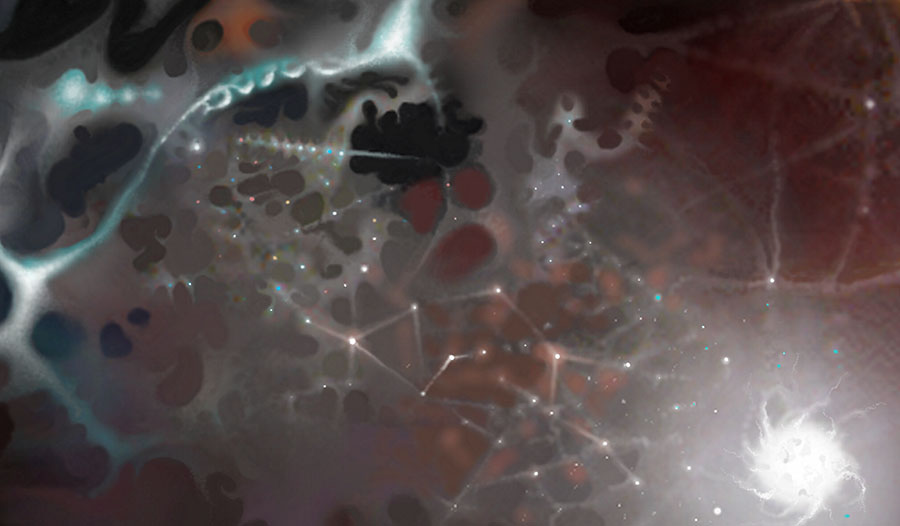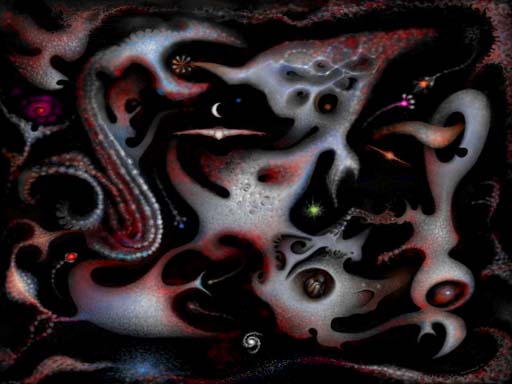 The digital process of freely panning and zooming into micro-macro deep scalar space is liberating and aesthetically satisfying. I view my monitor canvas as a night black atmosphere that anticipates emerging light, setting before me a sense of creation and mystery. My approach is painterly in that I utilize my digital paint software as I would oil pigment that can be molded fluidly and variously with the use of a pressure sensitive pen stylus. I begin by illumining amorphous forms and symbols. I try not to lose contact with my inner world in the sense that I keep unconscious and conscious mind engaged, opening myself to motifs that draw inspiration from my interest in human nature, evolution, physics, and the sciences with a particular attraction to astronomy and cosmology. Additionally, this blending of form and idea motifs echoes my absorption with human scale, cosmic connectedness, and meaning. My work is generally driven by a bio-cosmic universe appearing incredibly patterned, alive, complicated, utterly mysterious, and hauntingly beautiful—as well as unsettling and disturbing. I attempt in my work to evoke a cosmic reality that is fundamentally poetic, symbolic, interdependent, and touching all of us. Roger Ferragallo, 1992