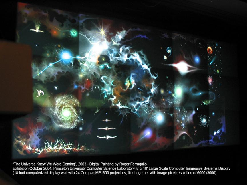 In 2004, the large work The Universe Knew We Were Coming appeared at Princeton on their 18′ display wall. This was followed by two unanticipated Southern California Universities (UCI and UCSD) in 2005–06 who had created the largest digital light display screens in the world. For me, it was the synchronistic culmination of an aesthetic dream that came to rest with the ongoing Cosmic Tree of Life. If that were not enough, in 2006 GigaPan, a global dynamic zoom panorama image system, appeared as a total surprise. GigaPan was the child of the digital age that fit all the visual parameters I envisioned for The Cosmic Tree of Life mural.