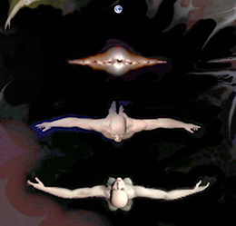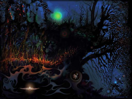 With the millennium’s wild wind at my back, my “The Universe Knew…” cosmo-lightscape underwent content and high resolution changes due to constant in and out circum-zooming of image and form in my search for meaning. As I neared the completion of this work, painting with light, there were moments that the unremitting electronic hum and din of my light generator machine breached ear and eye, tuning within me awe and wonder as I painted through many nights of reverie. The painting had grown evermore a cosmic phantasm, peopled with all manner of life and mystery.