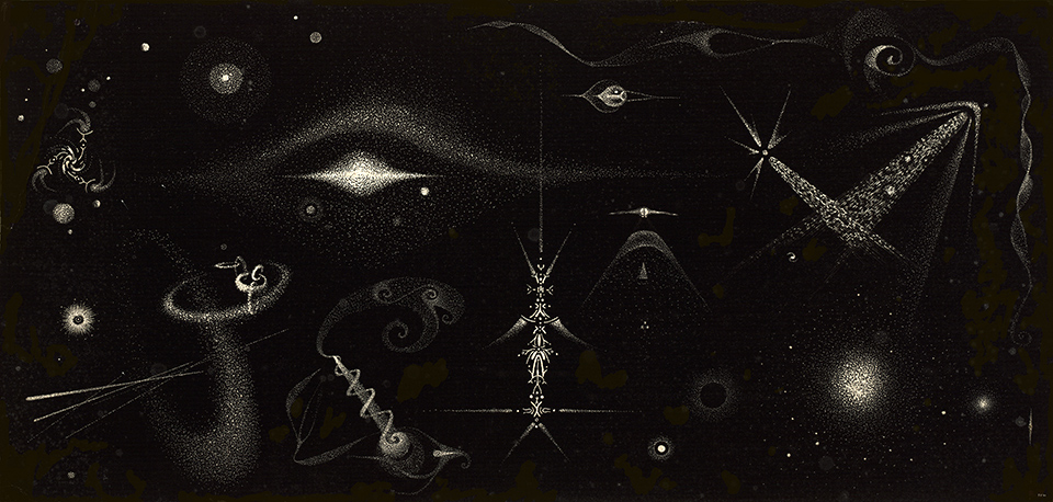 Birth in Space, Oil Crayon on Wood Panel, 20″ × 30″, 1961–62.