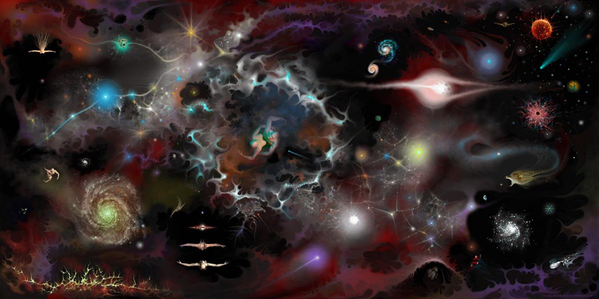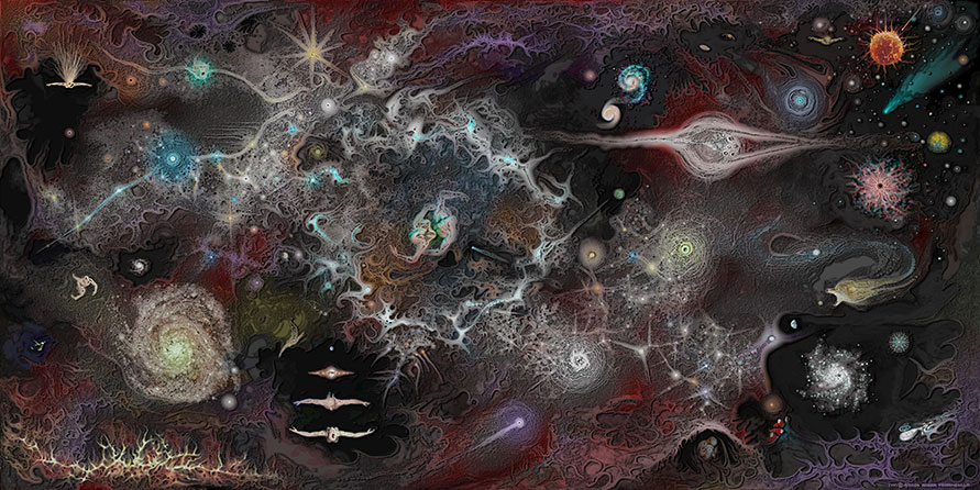The Universe Knew We Were Coming painting was conceived as a holistic bio-friendly cosmology to inspire a new artistic genre towards an art-science that could best be expressed through the all embracing luminal digital language. I could now proceed with a plethora of cosmic themes on a larger digital stage to paint with photonic light elements that speak to life, evolution, world, and universe. Indeed, our evolution gives us license to affirm the “universe knew we were coming” (Dyson) because “we are here as ‘conscious’ anthropic witnesses,” given the universal agency of cosmic fine-tuned physical constants and the realities of galaxies and supernovae. Accordingly, I began with a larger, more inclusive, 108 megapixel, 48″ × 24″ cosmic landscape, that arose from the unconscious to explore the mystery of conscious existence.