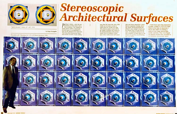 Painting is reborn….Enter the new awareness of Stereo Space and a New Aesthetics. The conquest of plastic forms within a monoscopic pictorial space is accomplished—a new era lies ahead for the visual arts. The living third dimensional space-field awaits its birth. It asks nothing more than the trance-like stare of the middle eye to invoke the Cyclops to waken from his 35,000 year sleep. This primeval giant’s reward will be the sudden revelation and witness to the dematerialization of the picture surface into an aesthetics of pure space where visible forms will materialize and release themselves—forms that are suspended, floating, hovering, poised, driving backward and forward—near enough to touch and far enough away to escape into the void… Roger Ferragallo, A Manifesto Directed to the New Aesthetics of Stereo Space, Visual Arts and the Art of Painting, Nov. 12, 1972.