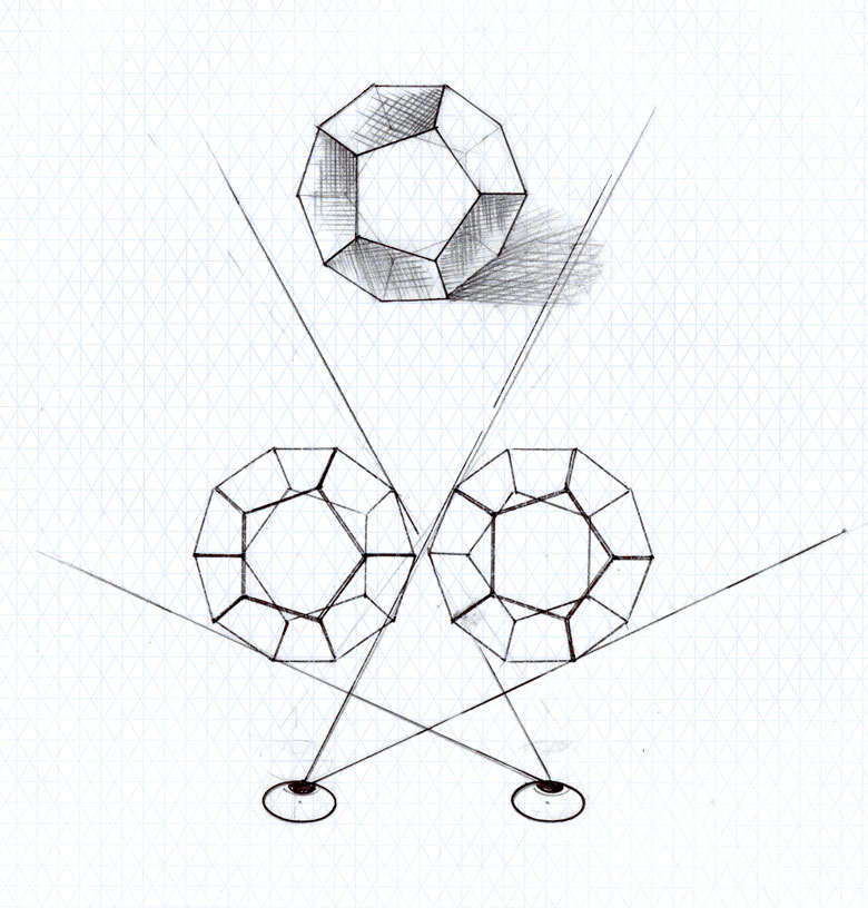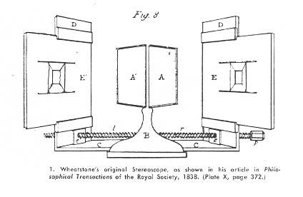 Normal stereovision automatically occurs in our brain when we focus on any object, near or far, in space with both of our eyes open. One can create objects on a sheet of paper that, in effect, make it possible to be viewed stereoscopically. The mind — the cyclopean eye — remarkably fuses two disparate left/right images to see them as one 3D reality. This great discovery was made by Charles Wheatstone in 1838. Wheatstone designed a device with two small frontal mirrors that reflect two hand drawn left and right disparate images that the brain fuses into one stereo reality.