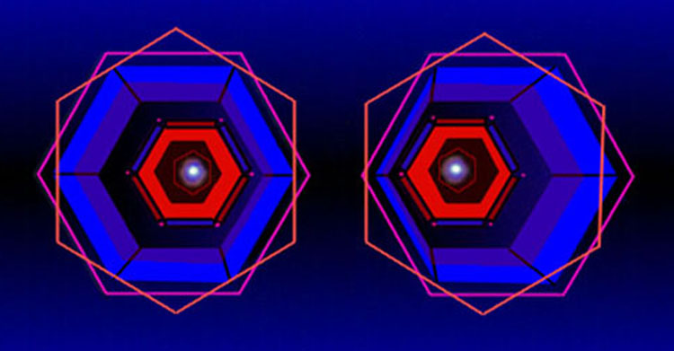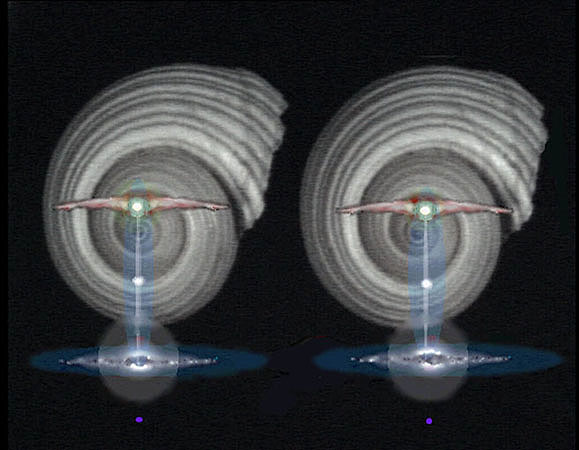 The entire series of sixty stereoscopic works were done without mathematics or algorithms. The light paintings with their 3D effects, were produced by maneuvering by hand, dual ‘right-left’ constructed and painted visual objects, viewed directly on my monitor screen with fixated naked eye, cross-sight free-vision. With stylus in hand, I was able to dynamically move, position, and pose objects in deep 3D space with exacting precision. Here was an enchanting newfound aesthetic experience that achieved a certain spatial magic by virtually transforming a small 14″ monitor screen into the larger realm of infinite space. It was memorable, at the start, as if my cosmic themes were emerging from the dark mystique of interstellar space itself. This unique series of stereoscopic works gave voice to the awe and wonder I felt throughout the period (1986–95).