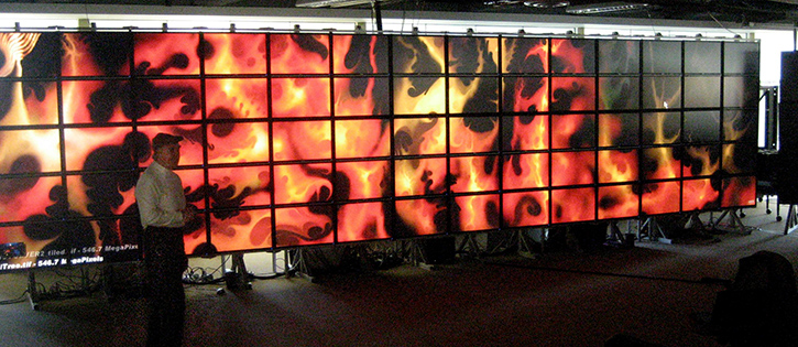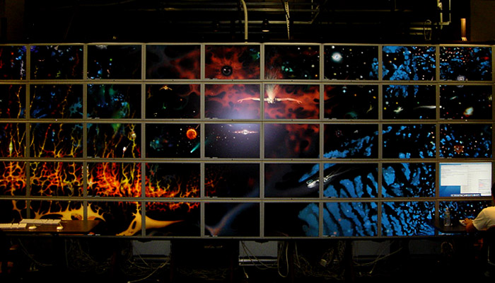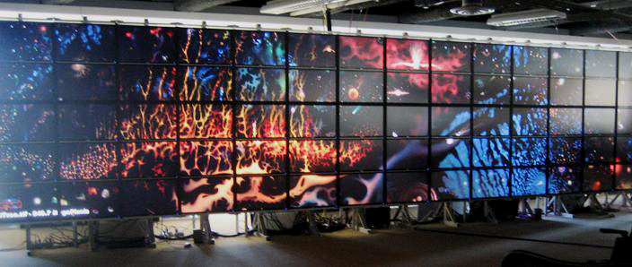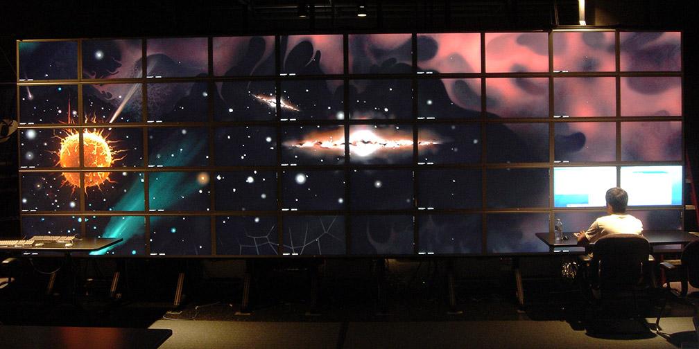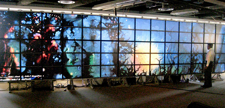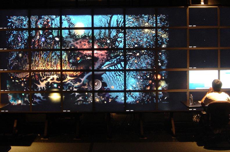 On the heels of the Princeton Screen, U.C. Irvine’s HIPerWall, and the Singapore exhibition, the mother of all screens surfaced at U.C. San Diego in 2007 with the massive HIPerSpace Screen, a multi-tiled 31.8′ × 7.5′, 286,720,000 million pixels display. With over 1⁄4 billion pixels, the HIPerSpace display was the largest in the world!