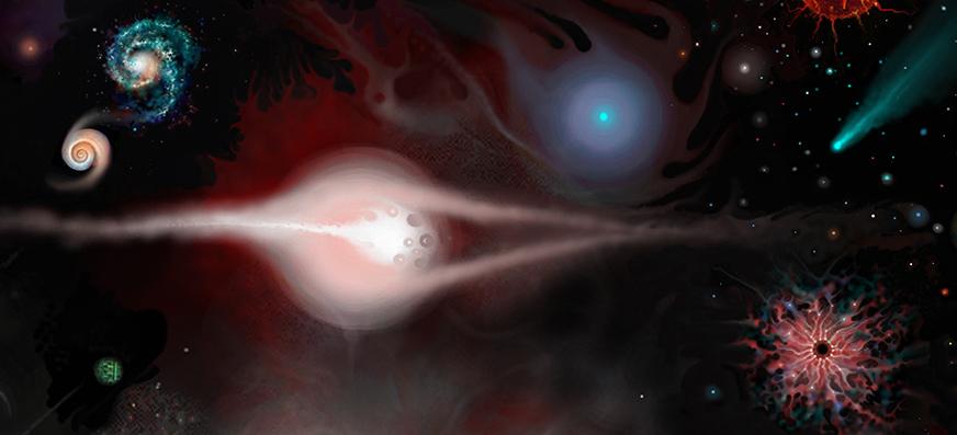 The seven larger scale paintings had served me well and were, by 1998–99, but cosmic threads in search of a broader thematic holism. It was an insightful moment—the cosmic subject too compelling and huge to contain the busy voices crowding my mind. The millennium air materialized into a photonic vision of a more wide-ranging visual vocabulary that would celebrate the vastness and complexity of the universe we observe! As a result, I chose my next painting to embrace a larger canvas ‘stage’ and to explore a more far-reaching comprehensive vision.