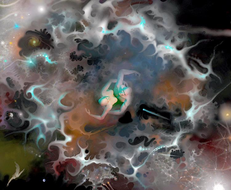 I engaged themes that ran from harmonious to wild, questioning an aegis spectrum that sought a participatory anthropic universe suited to the emergence of life and cosmos. My image themes appear as mystical cosmic forms, appearances, and metaphor to address our evolution and the phenomenal reality of our galactic home. The infinite beyond of trillions of galaxies weighed heavily as I pondered the incredulous vantage point of our sapient evolution on this infinitesimal ‘pale blue dot’ traveling the measureless immensity of space. I sought the interstellar deep with imagination ablaze. Causal life within us must have its strange moment of space-time evolution and dominion within the open arms of cosmic conscious life and solar warmth.