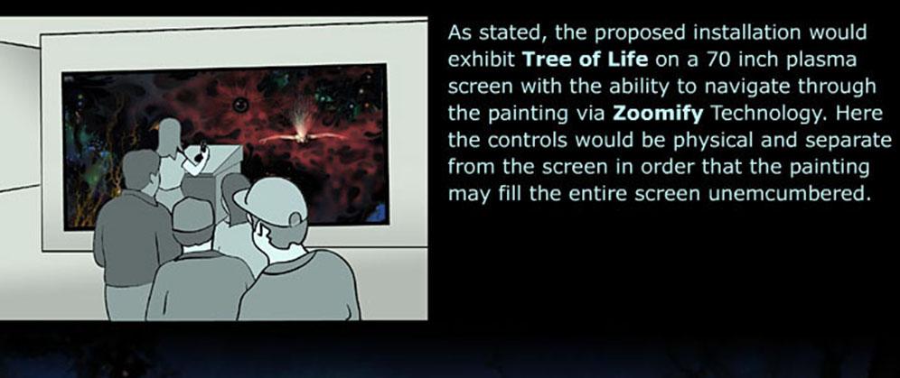 I’m a digital painter who has developed a digital work, “Tree of Life” [Ver. 1.0] measuring 23,600 pixels × 11,248 pixels × 300 dpi. Upon learning that the HIPerWall system at U.C. Irvine has the capability of displaying 200 megapixels as a single full-screen visual, I felt it timely to contact you. I understand the very important scientific nature of HIPerWall and its priority to many scientific fields, but I’m suggesting a fine art synergy to possibly display a work of art that, from its inception, was foreseen at the scale of the HIPerWall display. I’m excited by this prospect.