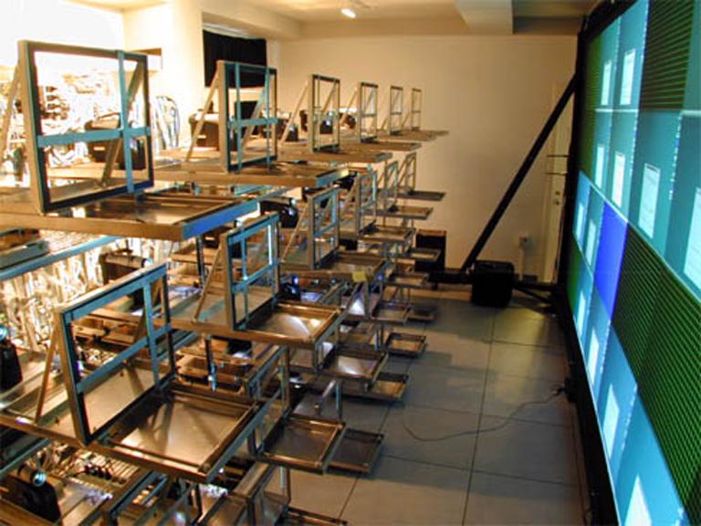 The combination—known as the Highly Interactive Parallelized Display (HIPerSpace 31.8 × 7.5 feet)—could thus deliver real-time graphics simultaneously across 420 million pixels to audiences in Irvine and San Diego. This capability would allow researchers at both U.C. sites to collaborate more intensively with each other, and eventually with other campuses, thanks to the rapid rollout of OptiPortals outside of California. — courtesy of UCI and UCSD.