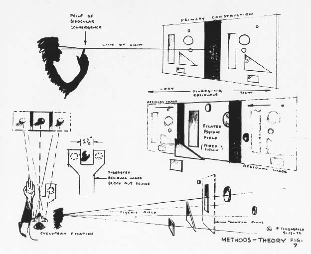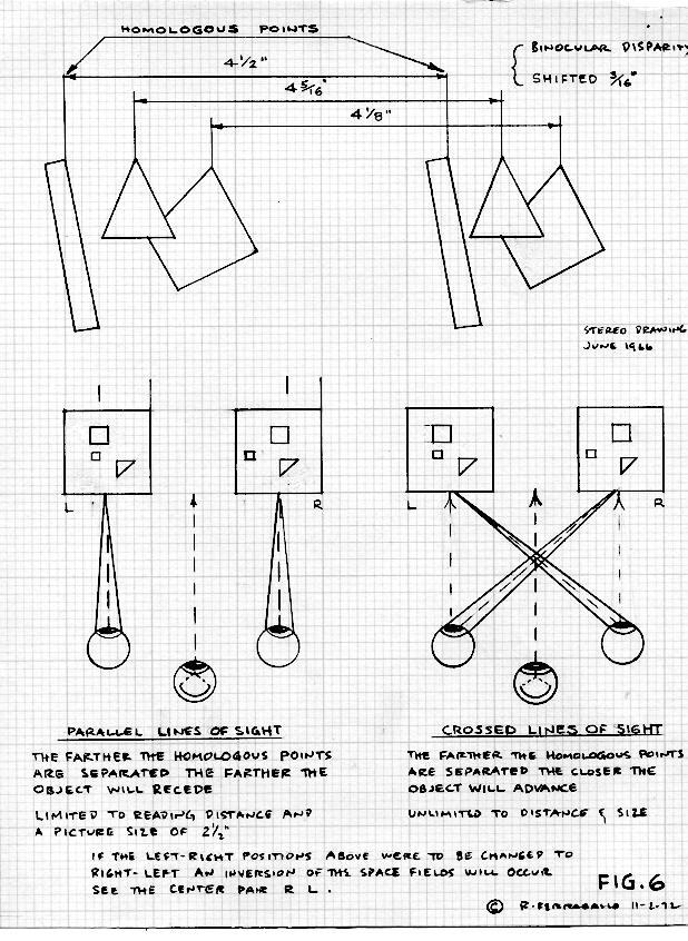 You stare—and willfully converge your eyes at your finger tip and at the same time observe the dual construction ahead as it divides into three images. It is at this instant that you stare at the third ‘central’ image—you gaze—concentrate—meditate fixedly upon the center image until it comes on you—and it will—with the clarity and power of sudden revelation. The painted forms will be seen to exist in real space, actually and concretely, as if in the nether world of dreams, you have just opened a cyclopean middle eye. Roger Ferragallo, “On Stereoscopic Painting,” Leonardo International Journal , Vol 7 No.2, Spring 1974.