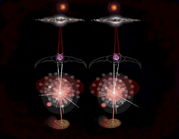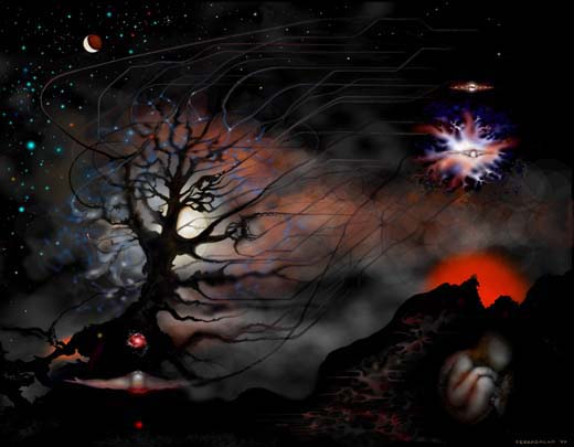 Now here is something I cannot over stress. Our universe does not have a beginning and it does not have an end. However, everything in the universe has a beginning and an end. But what is most amazing is that the universe embodies continuous ‘beginning’ and continuous ‘ending.’ What this means is that the symbolism of a “cosmic egg” is not the best. Although it is a popular representation, it is misleading if the purpose is to portray reality. The new representation of perpetual formation and balancing destruction is where the artist will be brought to task! What about the stuff in between?—between vast numbers of quantum beginning events on the one hand and numerous suppression-annihilation events on the other? This is the domain of all evolution. This domain I see represented by your Cosmic Tree of Life. The roots with the hair like tips represent matter formation events. The root network represents the evolution of subatomic particles towards basic matter. The trunk is the transitional link between basic matter and organic matter. The branching pattern traces the evolution of astronomical objects as well as the evolution of all forms of life. The branch or leaf tips ‘connect’ to blackness—a connection that symbolizes the flow of some object, large or small (or, more likely, its ashes), as it is absorbed into some terminal-type black hole (the ones with the SU-AN cores). Now picture this tree growing continually but never becoming bigger! — Conrad Ranzan, Cellular Universe Website