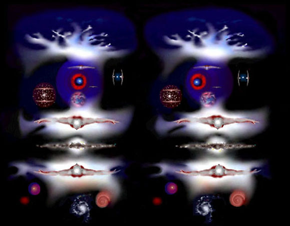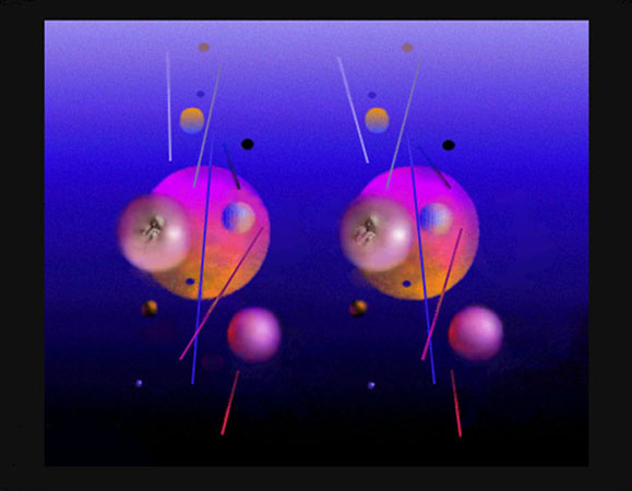 This choice was influenced by choices made in the prior decade of the 1970s. In 1972, I launched a series of unique, very large (historic) stereoscopic acrylic canvases that flourished until about the time computers began appearing. The acrylic works required "Cross-eye Free-vision” real-time viewing, which allowed viewing the painting in 3D without glasses. With the advent of computers, the digital medium set the stage for me to opportunely paint with light my first digital cosmic works (1986–96) within the reality of 3D stereoscopic space. The stereo-space methodology is amply described and illustrated in my published “Stereo Manifesto” in 1972 and my stereo painting article in the Leonardo International Journal “On Stereoscopic Painting” in 1974.